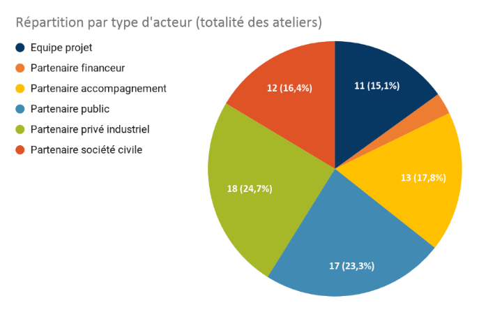 Nous observons un assez bon équilibre de la participation entre les différentes catégories de partenaires, avec une dominante des partenaires publics (23%), mais surtout privés/industriels (25%). Ce résultat suggère l’intérêt porté par ces acteurs au sujet, et probablement à l’apport en connaissance, au renfort des interactions avec les autres acteurs ainsi qu’à l’objectif de représenter leurs valeurs et intérêts. Nous constatons une plus faible participation des acteurs de la société civile. Nos ateliers se sont déroulés pendant des jours de semaine en journée, pouvant ne pas être compatibles avec une implication bénévole. L’utilisation des outils collaboratifs en ligne a également pu mettre certains citoyens en difficulté, et ainsi en décourager d’autres.