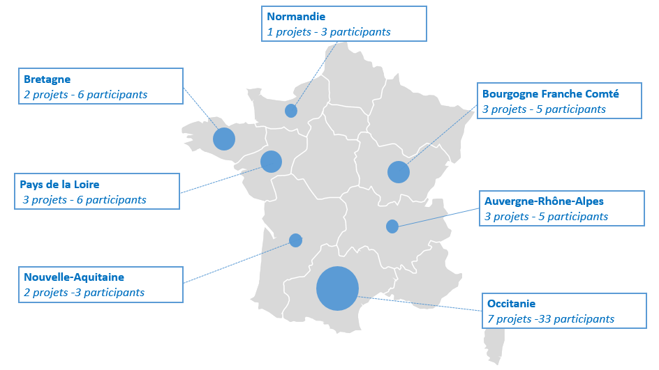 Occitanie pour les Ateliers n°1 et n°2A-2B-2C Plusieurs régions (La Bretagne, les Pays de la Loire, la Nouvelle-Aquitaine, l’Occitanie, l’Auvergne-Rhône-Alpes, la Bourgogne Franche-Comté et la Normandie) pour les Ateliers n°3A-3B et n°4