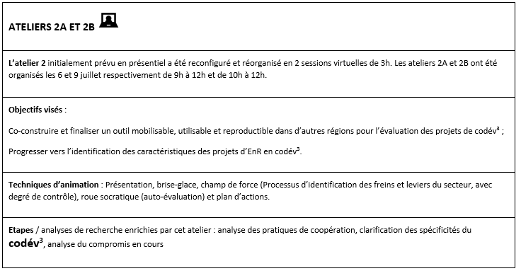 L’animation des ateliers participatifs a été assurée par les chercheurs et les consultants de l’équipe projet. Au sein de chaque atelier, nous avons réparti les participants en sous-groupes. Zoom permet de créer des sous-salles de conférence. Nous avons organisé jusqu’à 6 sous-groupes par atelier. L’animation de ces sous-groupes était peu formalisée à l’avance et dépendait des partenaires présents. Elle a été assurée par l’équipe projet et a aussi bénéficié de l’appui ponctuel des structures d’accompagnement intégrées dans le COPIL pour les ateliers 3A et 3B.