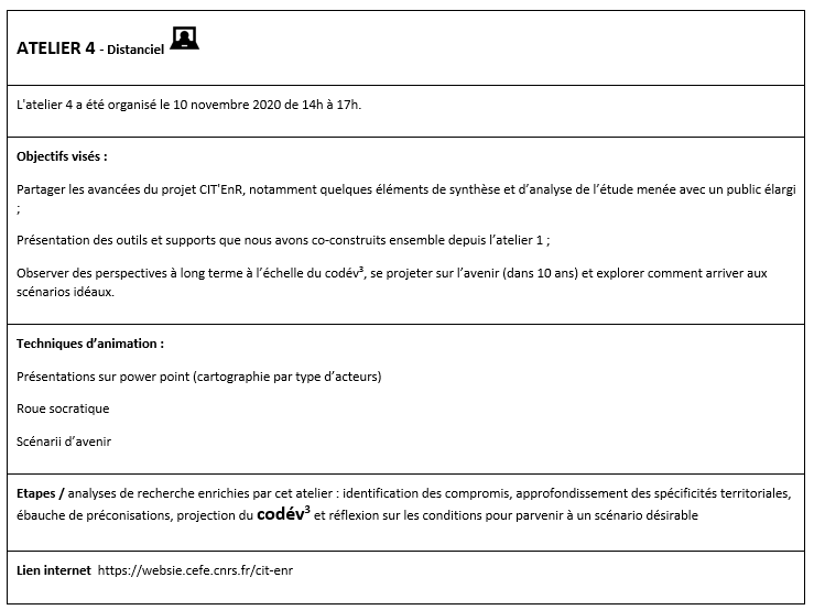 Tous les ateliers ont fait l’objet d’enregistrements audio et vidéo après une demande de consentement préalable aux participants. Ces enregistrements ont permis de compléter et de finaliser la prise de note afin qu’elle traduise le plus fidèlement les échanges. Tous les ateliers ont également fait l’objet de comptes rendus illustrés et dynamiques hébergés chez genial.ly [https://www.genial.ly/en]. Cet outil permet de créer des contenus interactifs sous la forme de livres à feuilleter. Le lecteur choisit ce qu’il souhaite consulter en priorité. Le format lui facilite et rend plus ludique la lecture en donnant vie aux contenus. Tous les genial.ly sont disponibles sur le site CIT’EnRhébergé par le CEFE du CNRS. https://websie.cefe.cnrs.fr/cit-enr/ateliers-rap-3a3b/