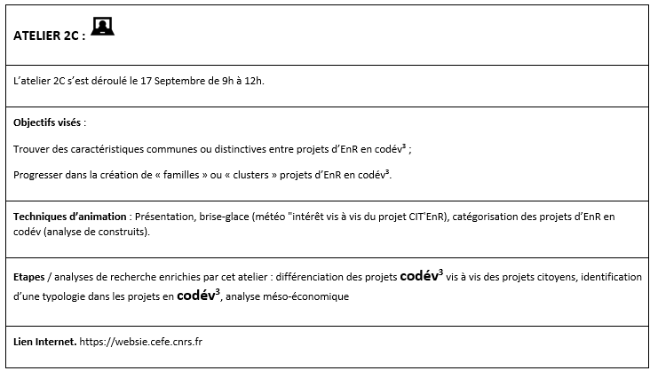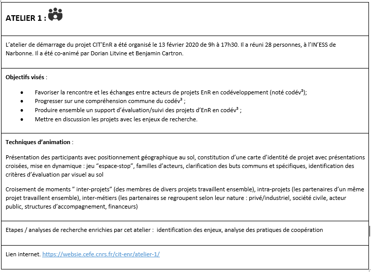 L’équipe RAP soumettait ensuite sa proposition à l’équipe de chercheurs de Sciences Po chargée des enquêtes et interviews du projet CIT’EnR, et parfois aussi aux partenaires de réseau/terrain du projet (Coopawatt, ECLR et EPV), afin de décider conjointement des objectifs et des « design » les plus appropriés compte tenu des besoins de chacun. Ces échanges étaient systématiquement consignés dans un traitement de texte collaboratif (FRAMAPAD).