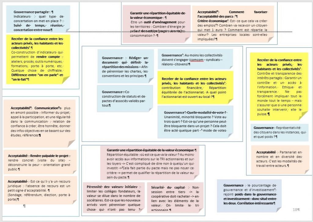 Dans l’atelier #1, les participants regroupés par tables ont généré une liste de critères d’évaluation. Une mise en commun s’est effectuée en plénière, chaque groupe de travail était invité à venir poser au sol les critères que son groupe avait identifiés. Cet exercice s’est poursuivi par un travail de regroupement pour aboutir à 6 grandes catégories de critères d’évaluation d’un projet en codév3 qui sont devenus les 6 grands critères de la roue CIT’EnR du codév3.